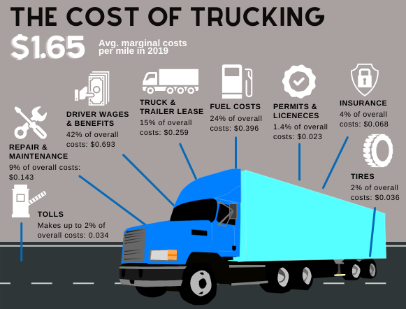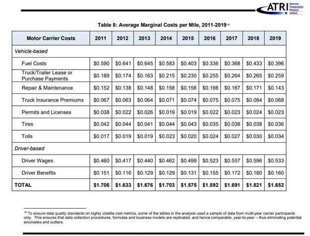 In 2019, the Avg. of marginal costs per mile incurred by motor carriers dropped 9.3% to $1.65 as the below table shows from ATRI;