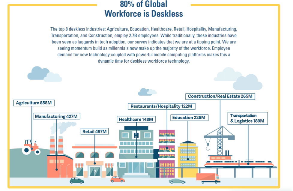 In today’s global workforce, 80% are deskless workers. According to the survey from EMERGENE, the top deskless workforce industries are: Agriculture, Education, Healthcare, Retail, Hospitality, Manufacturing, Transportation, and Construction, that employ 2.7B employees.