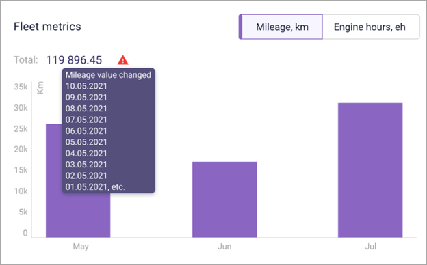 If you decrease the values of mileage and engine hours in the selected period, you will see a warning icon with a tooltip.