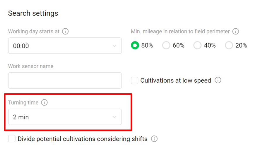 When Agri+ calculates mileage and fuel consumption, the turning time value defaulted to 2 minutes. However, this 2-minute default doesn’t apply to all businesses. For example, turning time could take longer when machinery is too bulky or terrain is too rough. Some users want to reduce the 2-minute period when a tractor works on two fields and moves between them.