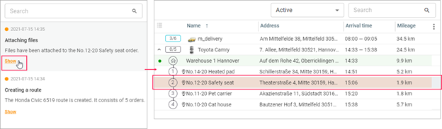 We also added the Show button to notification cards of all types, except for notifications when a route is deleted. After clicking on the button, the order or route is centered and highlighted in the table.