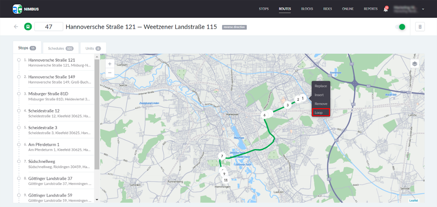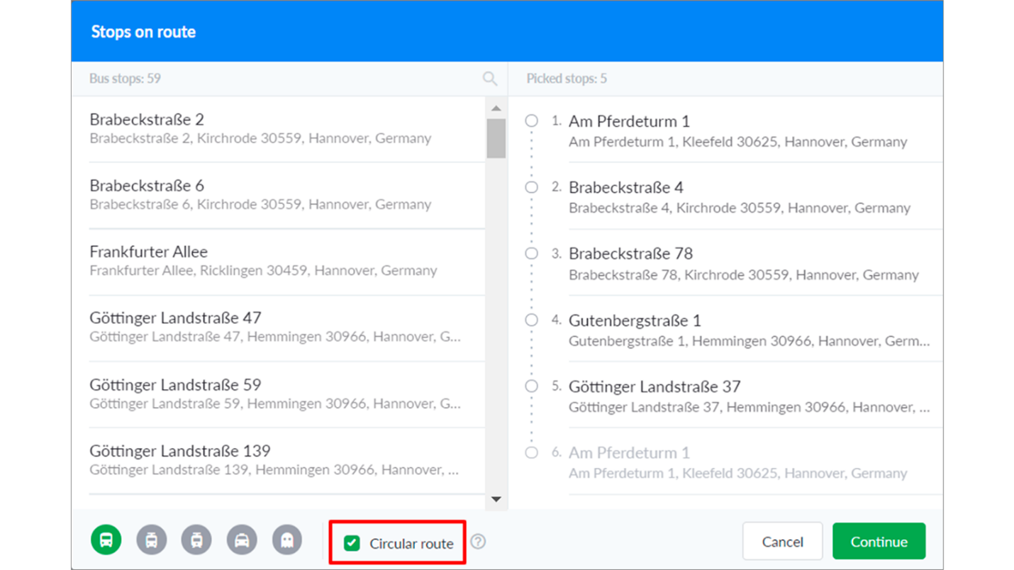 Please note that for reports, the time of visiting such a stop will be recorded twice: at the beginning and the end of the ride.