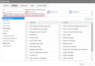 New filtration criteria have been added within the Access tab to search for objects and filter through results faster. You can search and filter by: Unit, Unit groups, Users, Resources, and Routes. Additionally, you can also search by Creator, Account Name, and Unit ID. This is especially useful when trying to change access to a group of units from a different resource or group in bulk (once you have filtered the right group of units, simply mass select and apply the desired access levels to all).